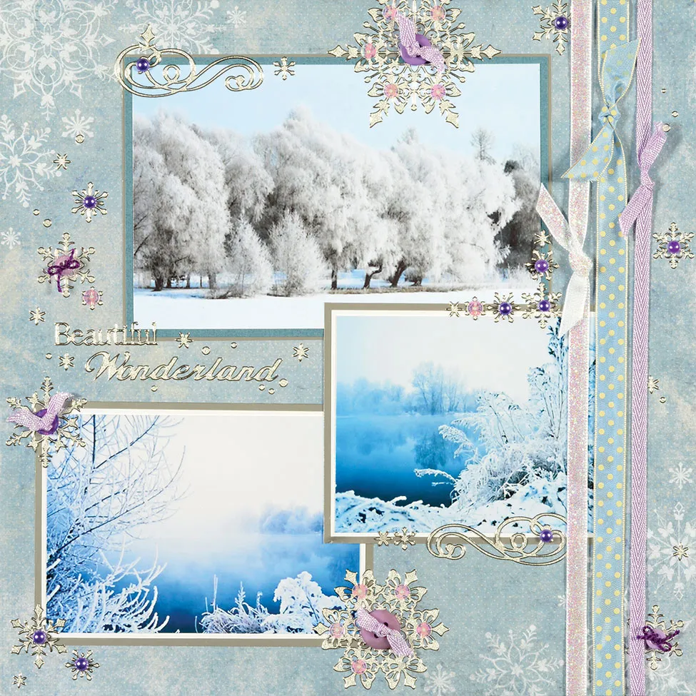 For the page: Mat the large photo on blue cardstock with 1/8" borders, then on Silver paper with 1/16" borders. Mat the small photos on white cardstock with 1/16" borders, then on Silver paper with 1/8" borders. Glue the three photos to the Winter’s Butterfly blue snowflake corner paper as shown.