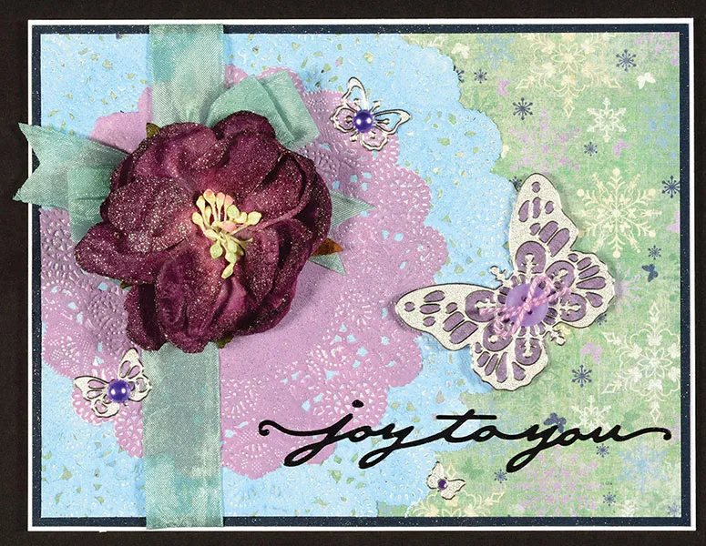 Place “joy to you” Dazzles™ at the lower right. Back a 2" butterfly Dazzles™ with Winter’s Butterfly purple paper, cutting along the edges. Attach the body to the front as shown with double-sided tape, tucking foam tape under the wings.