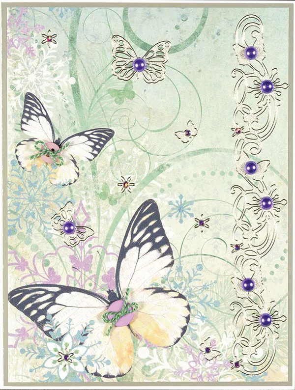 Place butterfly, snowflake, and border Dazzles™ on the front as shown. Decorate the silver Dazzles™ with jewel Dazzles™ and glue pearls as shown.