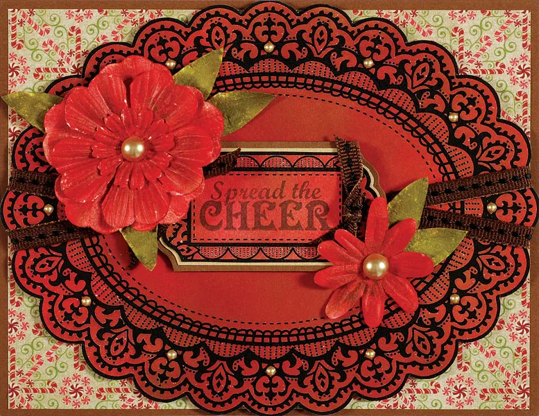 Cut out the Color Me™ 2 5/8"x1¼" blank label and color as for the doily. When completely dry, stamp “spread the cheer” on it with Timber Brown ink. Mat the label on tan cardstock with 1/32" borders, then on brown cardstock with 1/16" borders. Punch a hole in each end.
