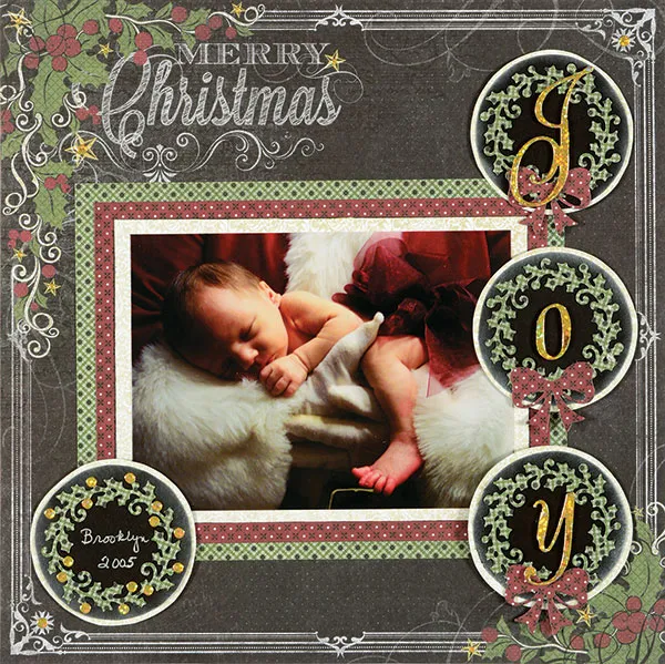 Mat a 7”x5” photo on Christmas Cheer cream/tan paper with ¼” borders. Mat on Christmas Cheer red/black paper, and again on Christmas Cheer green/black paper with 3/8” borders. Glue the photo 1½” from the left and 1 7/8” from the bottom. Foam tape the JOY circles on the right side of the photo, and the sentiment circle to the bottom left of the photo. Place Gold Jewel Dazzles™ around the page as shown.