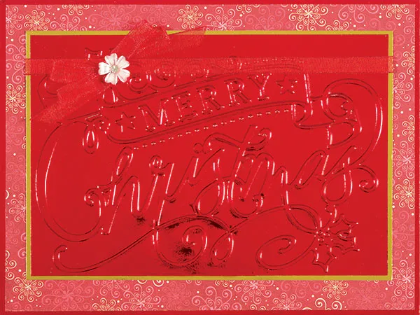 Cut red foil paper to fit the embossing folder, and very lightly spritz the back with water. Place inside the folder and emboss. Trim to 5½"x3¾" and mat on gold foil paper with 1/16" borders. Wrap ribbon across the panel, 3/8" from the top, and glue the ends to the back. Glue the panel centered on the front.