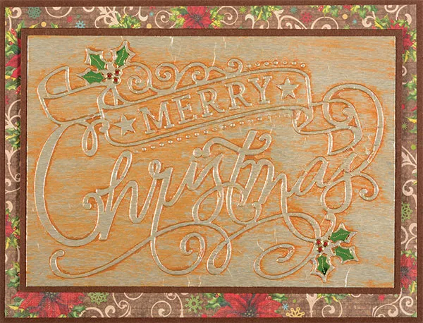 Cover the embossed panel with bronze paint and let dry just until tacky. Use a damp towel to wipe off excess paint, leaving an ‘antiqued’ layer around the embossed areas. Trim the panel to 5 5/8"x3 7/8", and mat on brown cardstock with 1/8" borders. Foam tape the panel centered on the card front, and then place Dazzles™ leaves and berries as shown.