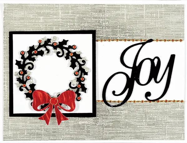 Mat 2¾” square of white cardstock with Black Suede Paper, leaving 1/8” border. Die cut a wreath from both Black Suede and Silver Linen papers. Glue both overlapping on the cardstock square and embellish with Red Jewel Dazzles™. Die Cut a Red Holographic Ripple Paper bow and Zot to the bottom of the wreath. Place a large Red Jewel Dazzles™ at the center. Die cut a Black Suede “Joy” and glue to the white cardstock border.