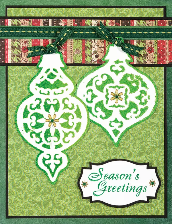 Cut out each stenciled ornament, leaving a 1/16" green edge along the outside. Glue the largest ornaments to the front as shown. Use the template to trace and cut a marquee label from white cardstock. Use the blending tool to pounce Avocado ink onto the “Season’s Greetings” stamp, and stamp it onto the label. Wash your stamp immediately.