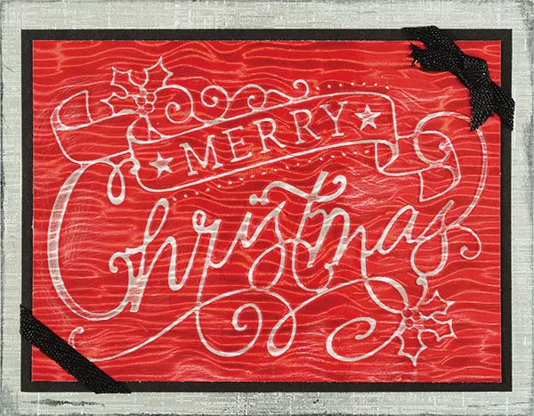 TECHNIQUE: Emboss Merry Christmas on a 5¾"x4” Red Ripple Holographic paper. Sand the color off the raised image. Mat on black cardstock with 1/8” borders. Wrap a metallic black ribbon on the top right and bottom left corners. Zot™ a knot to the top right corner. Foam tape to the card front, centered.