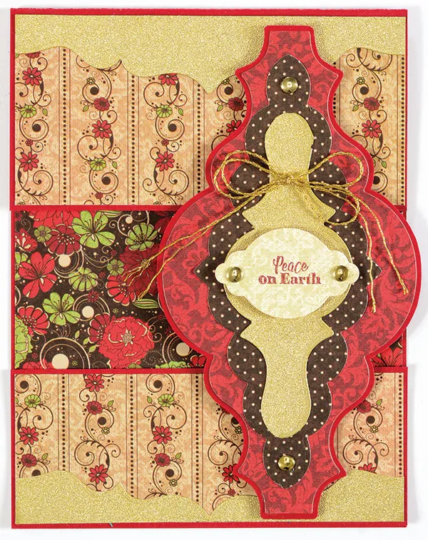 Mat the red tapestry shape on cardstock with 1/16" borders. Using the border die shown in the photo to cut the dotted shape, repeating the process as for the red tapestry paper and creating a 2¼"x5 3/8" shape. Glue centered on the tapestry paper. Repeat with a third border die on gold pearl sheet, creating a 1 5/8"x4" shape. Remove the backing and place as shown.