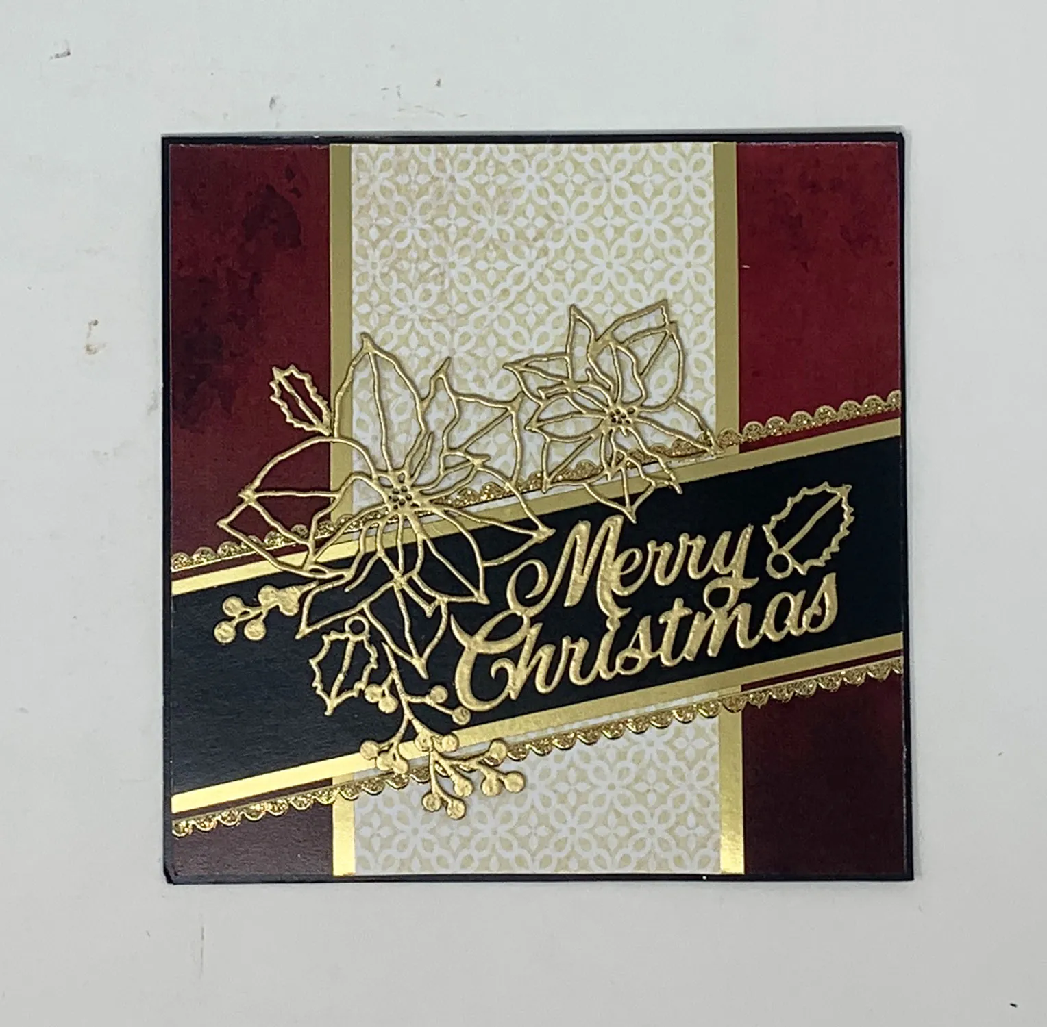For the card front: Cut 6"x12" Poinsettia Passion burgundy border cardstock with the flowers along the left long edge and the bottom. Fold it in half with the flowers inside, creating a 6"x6" card. Place the card with the fold at the top.