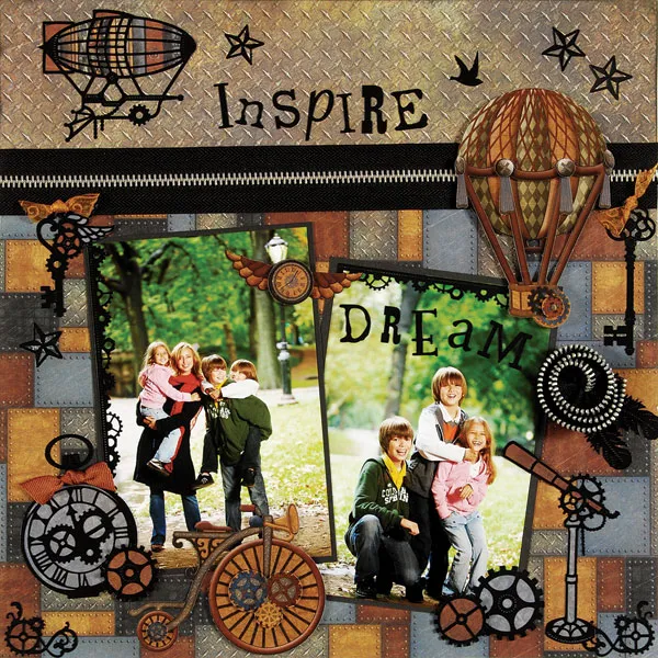 Background: Cut a 12”x3” strip of diamond plate paper and ink the edges black. Glue to the top of the quilted metal paper. Glue the black Zipper across the paper seam. Trim the zipper even with the page edges. Back the blimp with striped paper and glue to the top left. Adhere “Inspire” to the center above the zipper. Adhere Dazzles™ corner sticker to the bottom left and right corners.