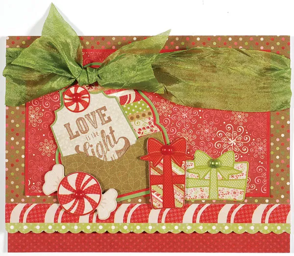 Use the template to trace and cut a curvy tag from Christmas Sweets tan dotted paper. Stamp “love is the light…” on it, then mat on green cardstock with 1/32" borders. Glue a candy die cut to the tag top, then place pearls as shown. Tuck the tag in the pocket.