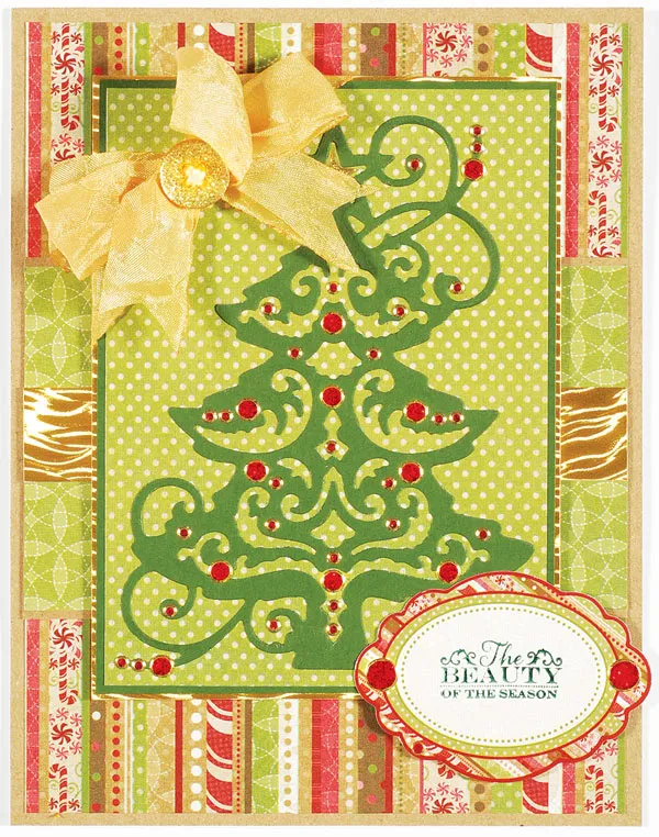 Make a 4-loop bow, tie the center with thread, and glue to the first ribbon. Thread a 5/8" button, then glue to the bow center. Punch out the 2 3/8"x1 5/8" Candy Cane label and stamp “the beauty of the season” on it. Glue and foam tape overlapping the tree at the lower right. Place Jewel Dazzles™ and a star as shown.
