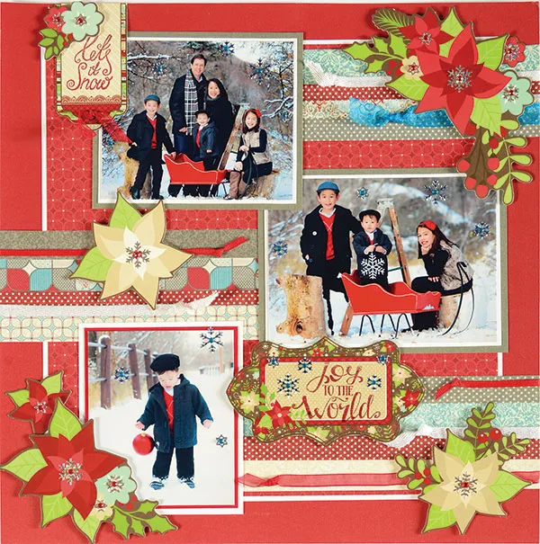 Stamp “joy to the world” on the label die-cut, then foam tape it to the page as shown. Glue the 1½" red poinsettia die-cut at the lower left and a ¾" red flower die-cut at the upper right corner as shown. Foam tape the remaining die-cuts to the page as shown.