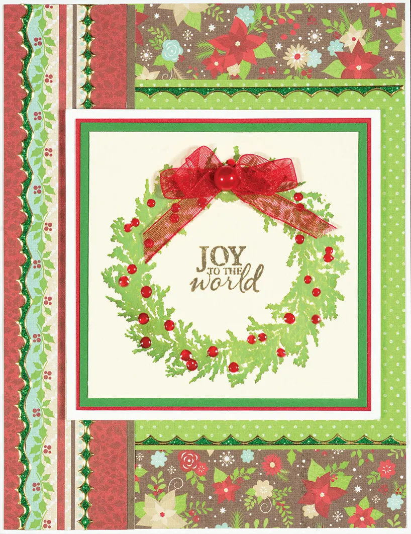 Mat the wreath on green cardstock with 1/16" borders, then on red cardstock with very narrow borders. Mat it on white cardstock with 1/16" borders, then foam tape it to the front as shown. Make a 4-loop ribbon bow and tie the center with thread. Use double-sided tape to attach it to the wreath at the center top. Glue a pearl to the bow center.