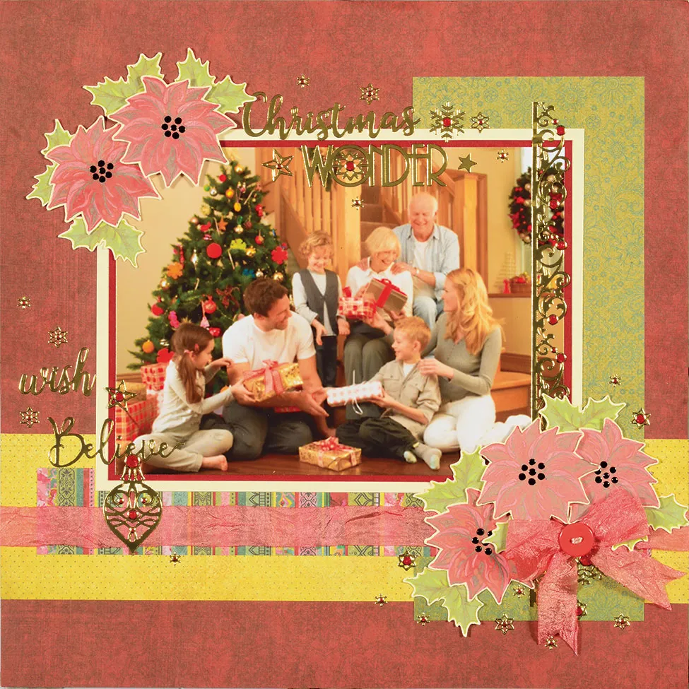 Glue one poinsettia and foam tape a second overlapping the photo’s upper left corner. Glue four leaf pairs around the blossoms as shown. Glue two poinsettias and foam tape a third overlapping the photo’s lower right corner. Glue five leaf pairs around the blossoms as shown.
