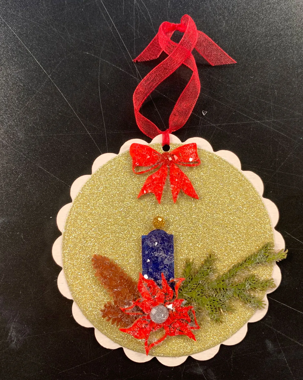 Rub glue over the front of the inked chipboard pieces, then cover them with Diamond Dust, pressing it into the glue. Let the glue dry, then tap off the excess glitter. Glue the chipboard pieces to the ornament as shown, overlapping the cones and flower.
