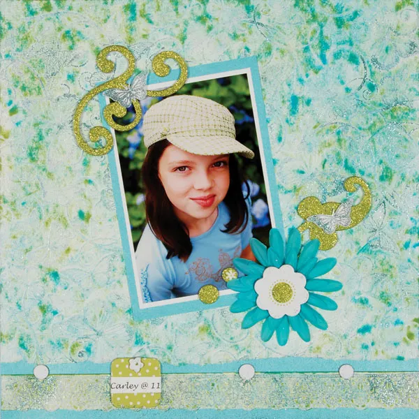 Mat the 4”x6” photo with both white and pearl blue cardstocks. Glue to the center of the page at an angle. Use Glue dots to adhere a green glittered swirl at the photo top left and a glittered leaf at the bottom right. Layer and glue 2 aqua blue flowers over the end of the leaf stem. Stack foam tape at the center of the silk flowers and secure a white chipboard flower. Glue 2 chipboard glittered circles to the left of the flower. Cut out the 2 Color Me Butterflies from the Tags & Border sheet. Emboss and glitter and glue to the swirl and leaf.