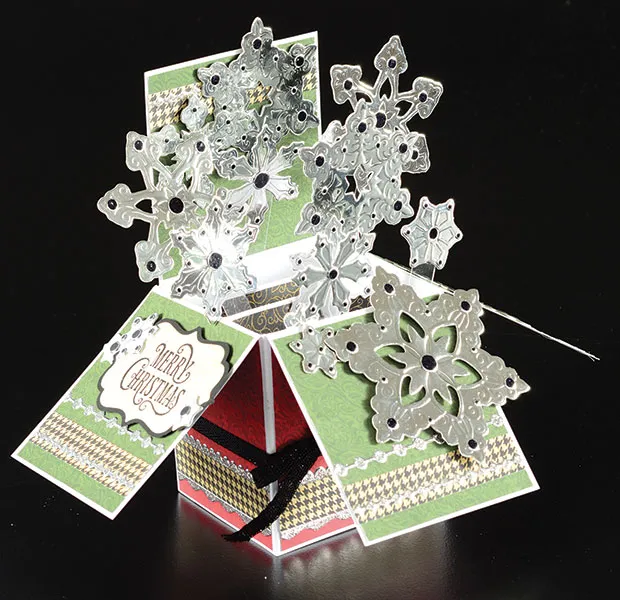 Attach a snowflake to each acetate strip with double-sided tape, then arrange them to look as though they explode out of the box, attaching the opposite ends of the acetate to the inside pieces. Attach more snowflakes to the inner pieces extending upward to fill any empty areas.
