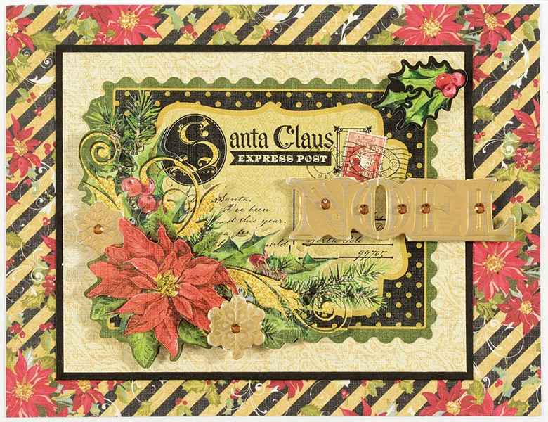 Punch out the Christmas Wonder post card paper tole pieces. Follow the package directions to assemble with foam tape between the layers, then glue it centered on the ivory paper. Punch out the extra art holly cluster and foam tape in the upper right corner.
