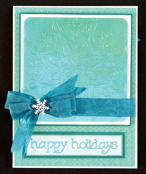 Place the “happy holidays” double-stick Dazzles™ on white cardstock, then dust both mica powders over the sticky letters. Trim to 3¾"x¾" and mat on aqua cardstock with 1/16" borders. Mat again on teal cardstock with 1/8" borders, then glue centered below the snowflake.