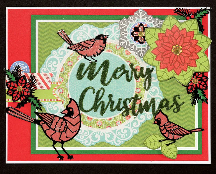 Punch out the 2¼" poinsettia and 1½" snowflake die-cuts and remove the nibs. Glue the snowflake and the poinsettia and holly Dazzles™ from step 4 in the upper right corner and foam tape the large poinsettia die-cut on top as shown. Punch out two small leaf die-cuts, remove the nibs, and glue at the lower right under the bird’s feet. Cover all the birds with the sparkle ink and place jewel Dazzles™ as shown.