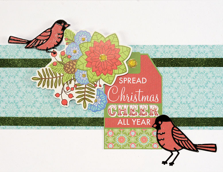 Place the three bird Dazzles™ shown on Merry & Bright red paper and cut along the edges. Glue to the front as shown. Punch out the striped “washi” tape and green banner die-cuts and remove the nibs. Cut the tape to 1½" long and the banner to 1¾" long, then glue to the left edge as shown. Punch out a circular snowflake die-cut, remove the nibs, and glue extending from under the washi tape die-cut.