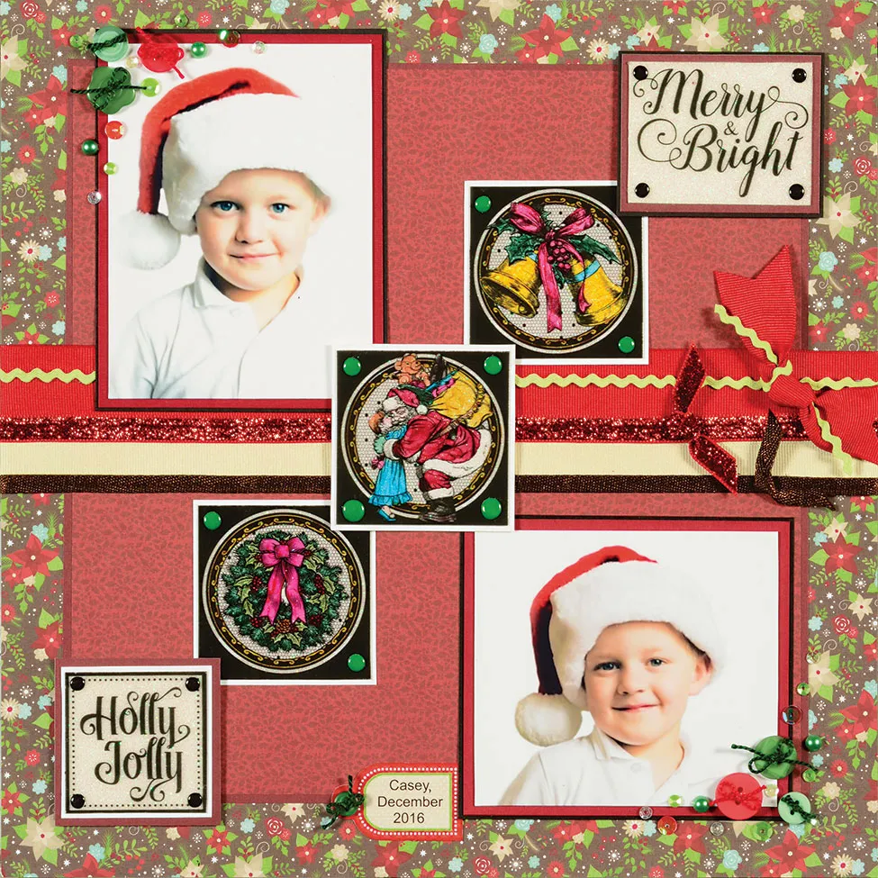 For the page: Cut 10"x10" Winter’s Garden red holly paper and mat it on maroon cardstock with 1/16" borders. Glue it centered on a Winter’s Garden brown floral paper. Cut one 14" length of each of these ribbons: red grosgrain, ivory grosgrain, red sparkle, brown glimmer, and green rickrack. Wrap them across the page as shown, gluing the ends to the back.