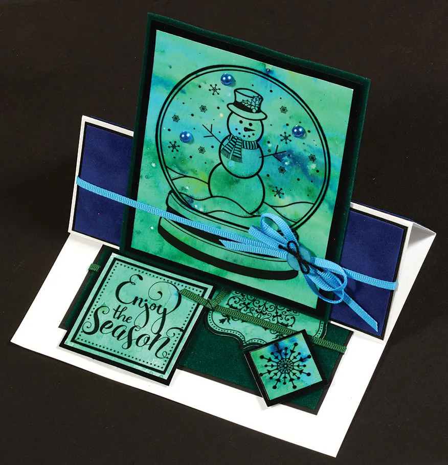 Trim the first watercolor panel to 3¾"x4½". Cut out the Clearly Creative snowman snow globe, then use tiny pieces of double-sided tape to attach it to the center of the inked panel. Mat the panel on Black suede paper with 1/8" borders, then on Forest suede paper with 1/16" borders. Glue the panel just to the lower half of the center front, slipping it under the ribbon and aligning the lower edges.