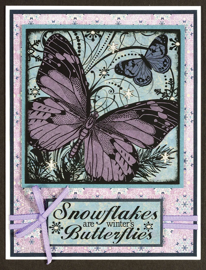 Use tiny pieces of double-sided tape to attach the paper butterflies to the back of the acetate butterflies, aligning the edges. Back the square with Winter’s Butterfly light blue snowflakes paper, trimming off the excess. Mat the square on blue cardstock with 1/16" borders, then foam tape it to the front, ½" from the card top.