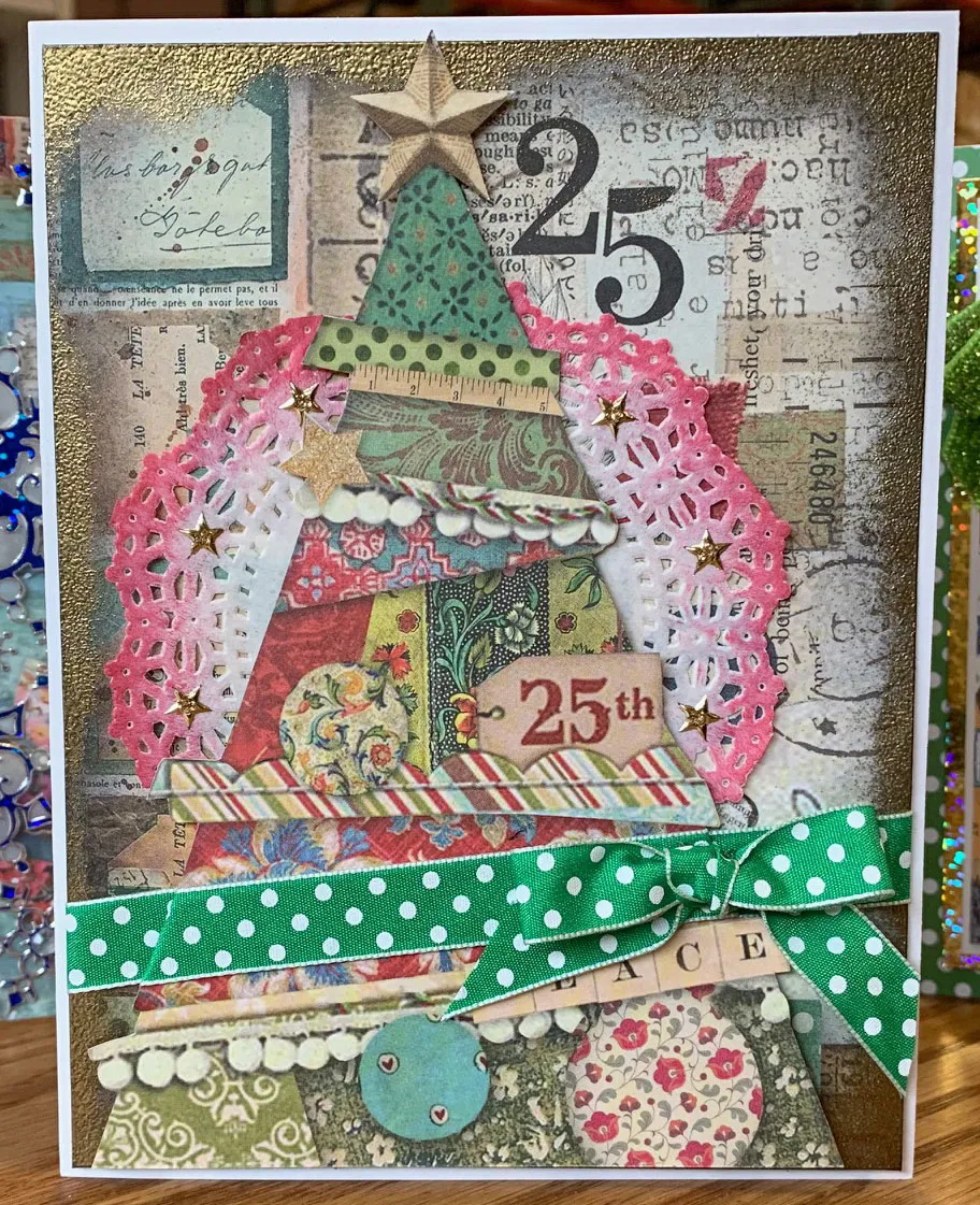 Select the sheet of paper with the tree collage. Cut to 4 ¾”x6 1/4” being sure to have the 25 about 1 ¼” from the right edge toward the top. Using a cosmetic wedge and black Staz On® go around edges a half an inch. Go over edges with Versa Mark™ about ¼” going a little heavier in the corners and cover with Gold embossing powder and melt with a heat gun. Go over edges of doily with red ink. Using off set 1 ¼” from top and ¼” from left side. Add stars Dazzles™ to the circles on the doily. Zot™ green dots ribbon to the back of card and across the front at a diagonal, as shown. Cut out the tree so the star goes to the top of the collage paper and is even with the bottom of the paper. Attach ribbon onto the tree on the same diagonal as the one on the card base so they match. Tie a bow and Zot at the right end of the tree.