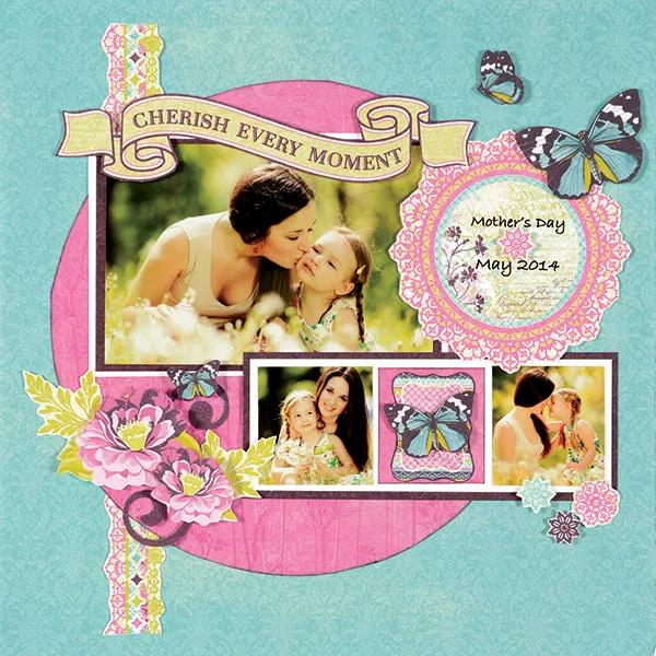 Write or print on the Unforgettable die-cut pink doily and glue to the right side of the large photo. Foam tape large and small butterfly die-cuts and the “Cherish Every Moment” title as shown.