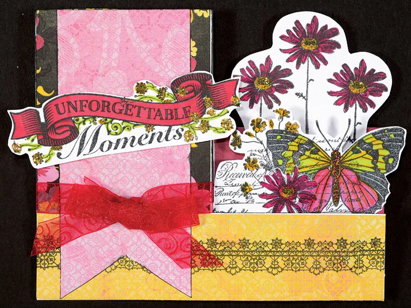 Stamp the large butterfly stamp, the Unforgettable Moments stamp, and three tall daisy stamps on white cardstock. Color with the Spectrum Noir™ pens, and cut each out separately close to the edges. Foam tape the Unforgettable Moments paper at an angle on the left side. Glue the butterfly on the bottom riser, so it shows above the front step. Glue the three daisies to the back riser so the tops are even with the left side. Tie a bow around the left side. Add a few small touches of Stickles™ as shown.
