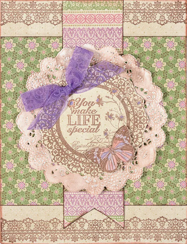 Front: Place your card with the fold on the side and cover with tan dot Kindred Spirits Paper. Stamp the lace border in brown ink along the card top and bottom. Ink edges of 5”x4½” green floral Kindred Spirits Paper and glue across the card center. Cut a “V” shape from one end of a 1 5/8”x6” striped Kindred Spirits paper, ink edges and glue even with the card center top. Use the stylus handle and pad to apply brown ink to the doily and glue to the card center. Stamp doily and “You make Life Special” on tan dot Kindred Spirits Paper and cut out around the doily outside edge. Stamp a second doily image on tan dot paper and cut out butterfly image. Paint butterfly with Smooch™ Inks and let dry. Foam tape butterfly cutout over butterfly on doily. Place dots of Grape Soda Smooch™ Ink on the flower centers and let dry. Foam tape doily image to the center of paper doily. Use ½” wide length of lavender swirl Kindred Spirits Ribbon to make a bow and Zot to the top left side of the doily image as shown.