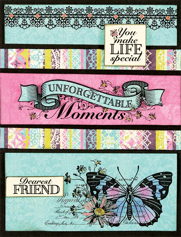 Stamp “Unforgettable Moments” on Unforgettable pink paper and cut to 5”x1 3/8” wide. Ink and mat the long edges, leaving 1/8” borders and glue to the center of the striped paper. Stamp again on aqua paper and cut out banner. Foam tape the banner over the pink stamped image.