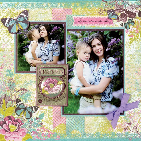 Assemble the “Happiness” Unforgettable Foil Paper Tole with foam tape and glue overlapping the photos as shown. Use ½” wide lavender grosgrain to make a bow and Zot to the bottom right corner of the large photo.