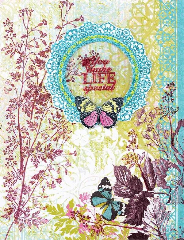 Stamp the tallest stem on a piece of scratch paper to use as a mask. Cut close to the stem edge. Ink the stem again with Black Cherry ink. Stamp on the fold of the card. Cover it with the mask, and ink and stamp again just over the first stamp. Keep masking and stamping. Stamp a few of the smallest stem here, and near the butterfly corner. Ink the wreath stamp in Arctic Deep ink, stamp, and cover with Totally Teal embossing glitter. Tap off the excess, and heat emboss. Color just the small band closest to the center. Cut out the wreath, close to the inside, and outside edges. Stamp the wreath again in black ink. Color just the butterfly with watercolor pencils, and cut out close to the butterfly edge. Foam tape over the butterfly on the wreath. Cut a 2¼” circle from the acetate. Stamp “You make LIFE special” in Black Cherry ink, and heat emboss with clear embossing powder. Glue behind the wreath. Foam tape to the card front.
