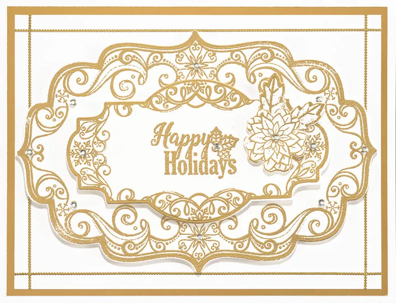Die cut 5 7/8"x4 and 4¼"x2 3/8" labels from cardstock. Stamp the matching design on each, then cover with embossing powder. Tap off the excess powder and use the heat gun to melt the remainder on each tag. Stamp and emboss “happy holidays” in the center of the smaller label.