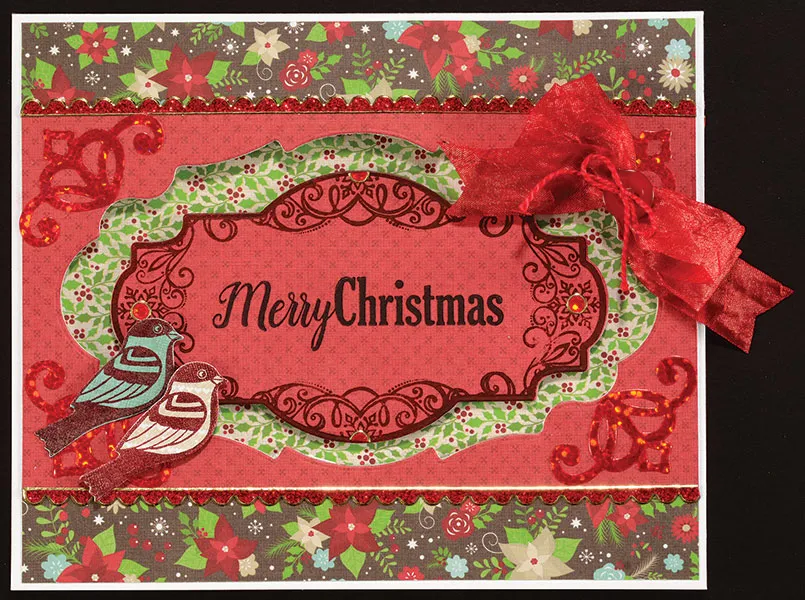 Place Border Dazzles™ along the upper and lower edges of the red paper, trimming the excess. Die cut a bird from Winter’s Garden blue paper and one from tan stripes paper. Stamp the matching design on the birds with Scarlet ink, then glue the blue bird and foam tape the tan bird at the window edge as shown.