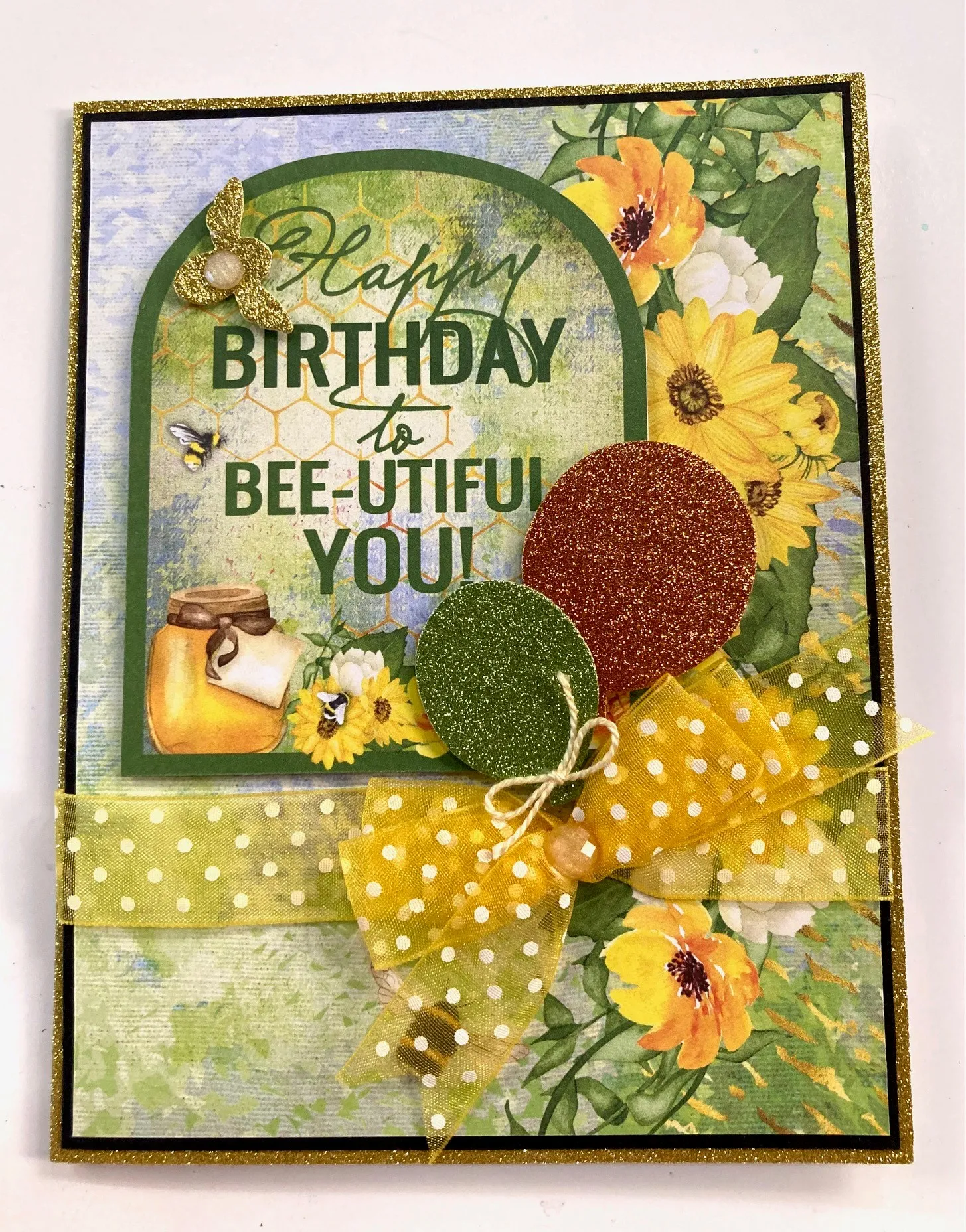 1. For the card front: Cut 4¾"x6¼" Bee Happy green/blue border cardstock and mat it on black cardstock with 1/16" borders. Cut out and foam tape the “happy birthday to bee-utiful you” label near the upper left corner. Wrap yellow dotted sheer ribbon across the cardstock below the label and glue the ends to the back. Glue the cardstock centered on the front.