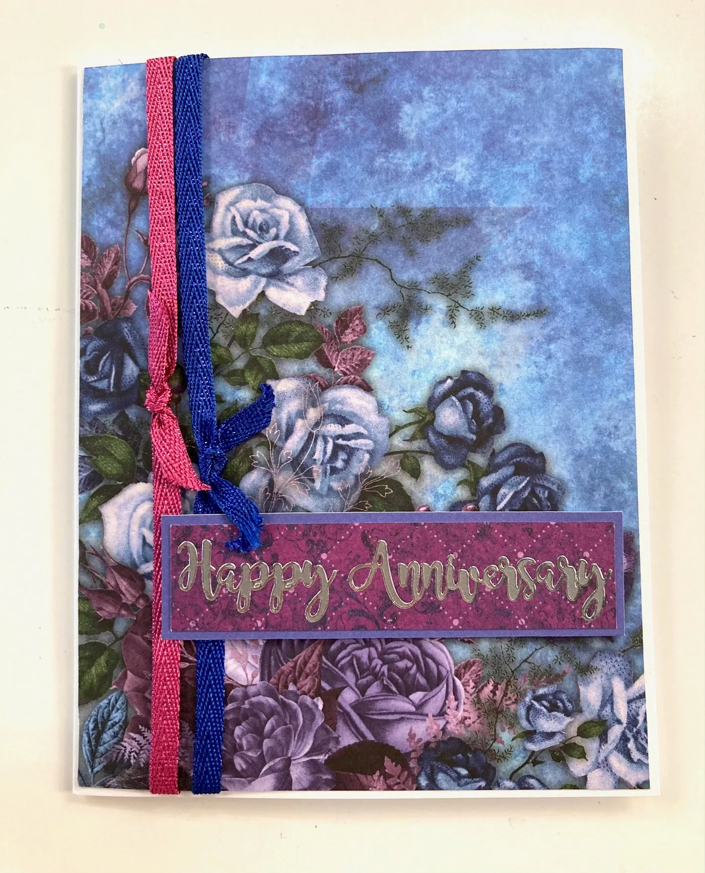 1. For the card front: Cut 4⅞"x6⅜" Mystic Moon blue rose corner cardstock. Wrap fuchsia and dark blue glimmer ribbons over the cardstock, ¾" and 1⅛" from the right edge, and glue the ends to the back. Tie short ribbons onto the first as shown, and trim the ends. Glue the cardstock centered on the front.