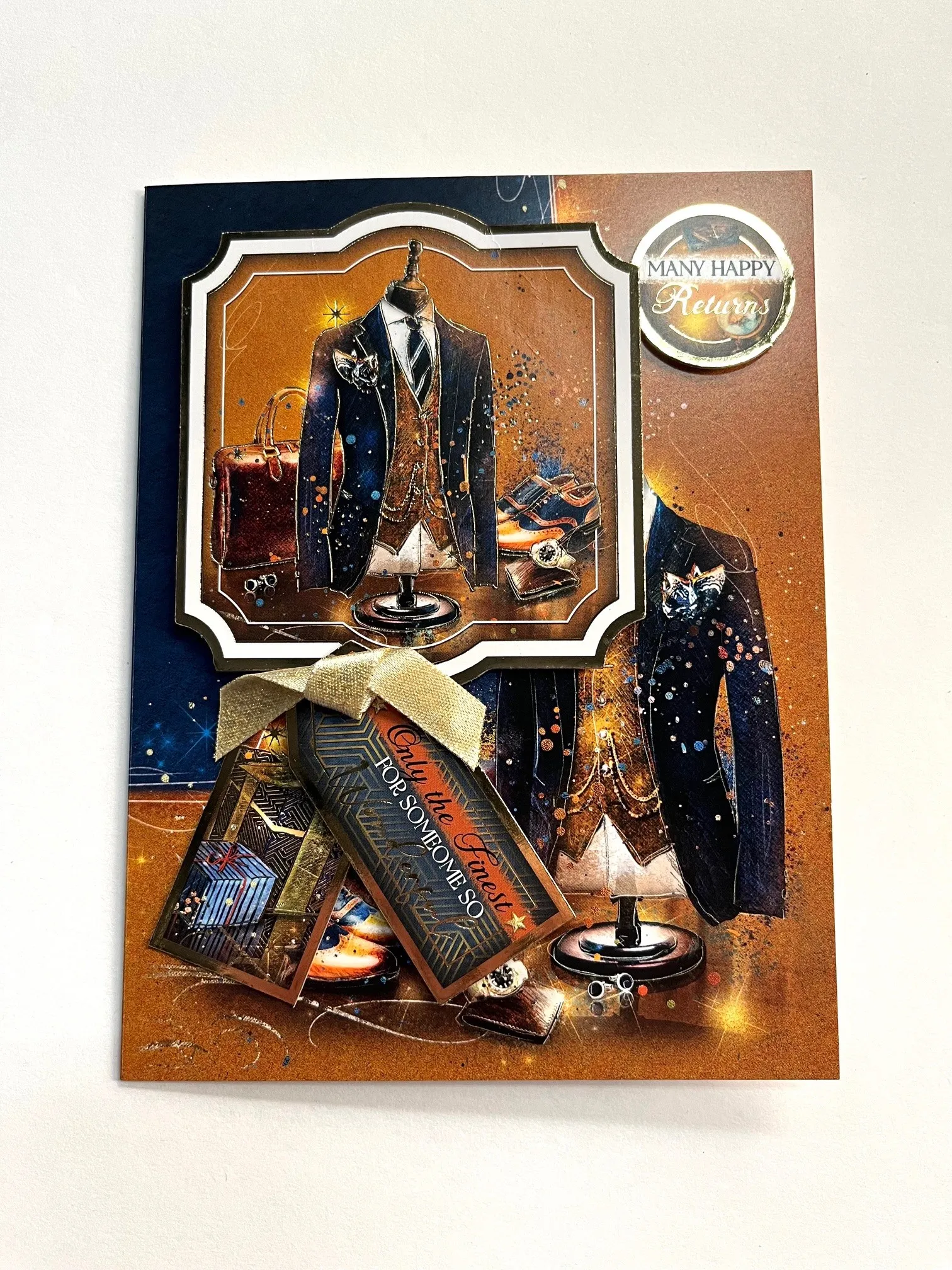 2. Foam tape the mannequin die-cut on the upper left. Glue the present tag die-cut and foam tape the “Only the finest” tag overlapping. Foam tape “Many Happy Returns” from the On the Move Topper set on the upper right.