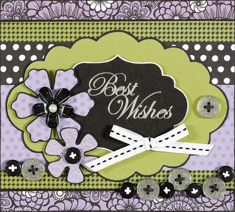 Trim the card to 5 1/2"x5” and place with the fold at the top. Cover the card with Simply Susan purple/black/white floral paper. Cut a 5 1/2”x4” Simply Susan green/black patterned paper and mat long sides on black with 1/16” borders. Glue centered on the card. Glue a 5 1/2"x1” Simply Susan black/white dotted paper on the green/black patterned paper 1” from the top. Glue Simply Susan lavender dotted paper on the green/black patterned paper even with the bottom edge of the black/white dotted paper.