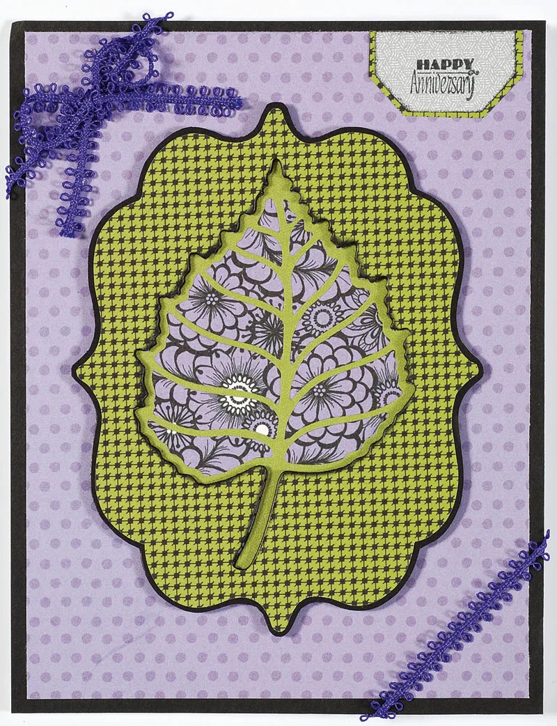 TECHNIQUE: DIE-CUT WINDOW Trace and cut out a Bracket Label-A from Simply Susan olive squares paper and mat on black cardstock with a 1/16” border. Following your die cutting machine manufacturer’s instructions cut a large leaf from the center, saving the die-cut for the card inside. Ink the edges of the cut-out window and foam tape over the floral label.