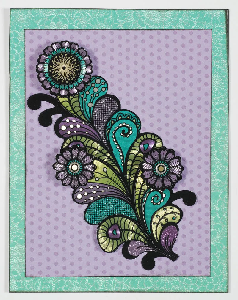Card front: Place your card with the fold on the left. Cover with Simply Susan teal floral paper. Cut 4 1/4”X5 3/4” Simply Susan purple dot paper. Ink edges and glue to center of the card.