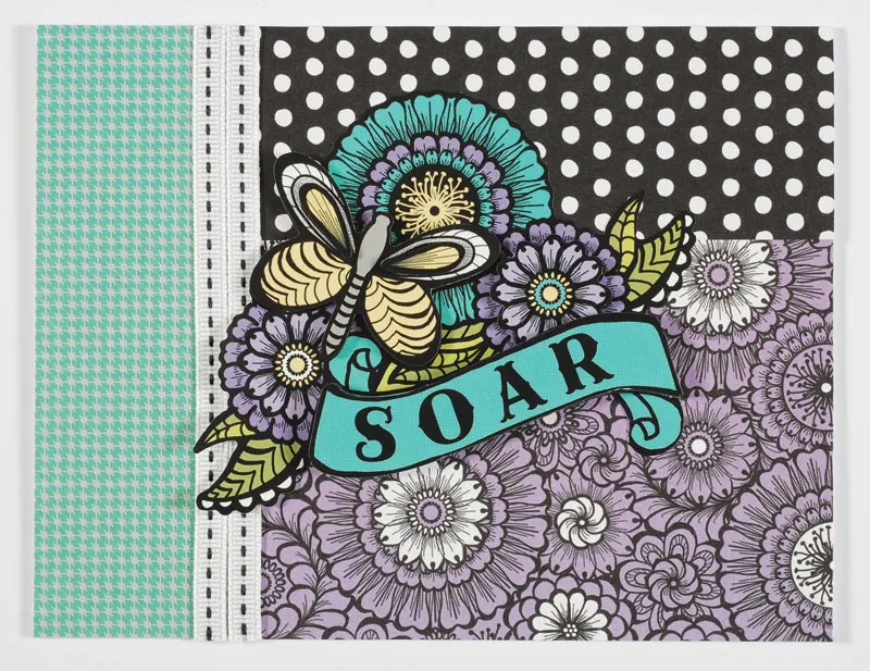Card front: Place your card with the fold on the top. Cut a 5”x5” Simply Susan purple floral paper and glue to the right side of your card, as shown. Cut a 5”x1 3/4” Simply Susan black dot paper and layer over the top right side of your card, as shown. Cut a 1 1/2”x5” Simply Susan teal houndstooth paper and glue to the left side of your card. Cut 2 – 5” Simply Susan white stitch grosgrain ribbons and glue side by side over seam, as shown.