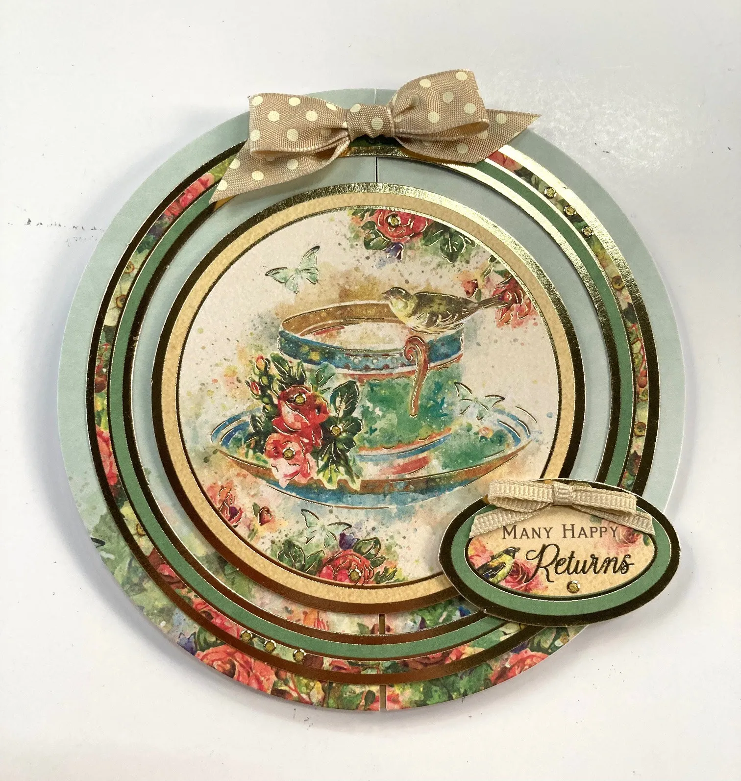 Glue the outer frame of the large circle Topper centered to only the left side. Foam tape the teacup inner Topper to only the right side centered in the outer frame. Foam tape "Many Happy Returns" Topper to the outer frame lower right. Make and Zot™ a 1" wide ivory bow to the top. Make and Zot™️ a 1 1/2" Ivory bow along the top of the outer frame. Place gold pearl Dazzles™️ as shown.