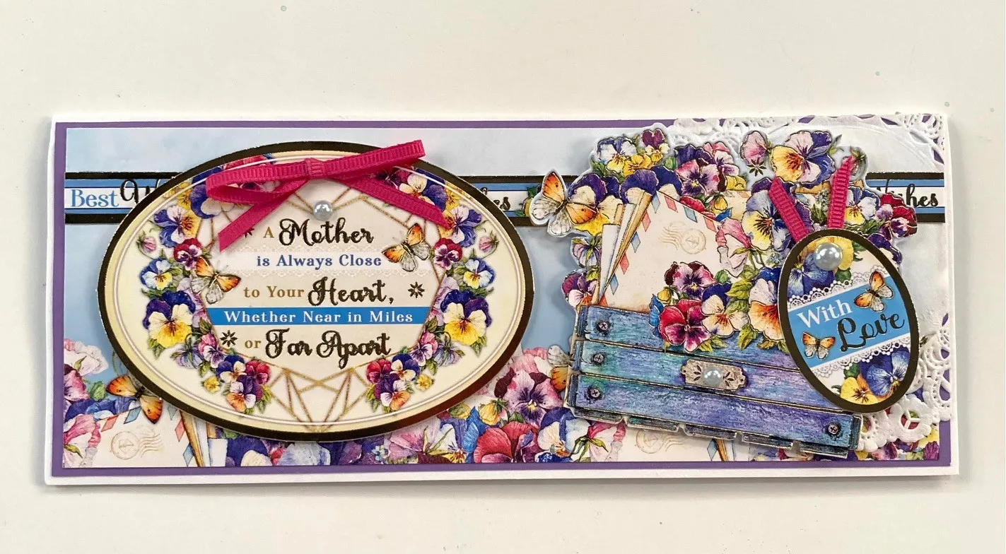 Card inside: Cover the inside card base with the tape runner, lay the blue cardstock from the Windflowers collection on top, and trim off the excess. Cut 8 1/4"x 3 1/4" of the corresponding insert and glue over the blue cardstock. Foam tape the oval basket and flowers Topper1/2" from the right edge. Foam tape the small butterfly next to this on the upper right corner and place a pearl in the center of it. Zot™️ a purple knot onto the basket as shown. Use the tape runner to place the "Happy Birthday" Topper 1" from the left. Make and Zot™️ a 1 1/2" wide purple bow at the top and place a pearl below it. Cut a quarter of a doily circle and adhere using Sticky Specks to place in the lower left corner as shown. Foam tape the small pansy Topper onto the doily and the sentiment. Place tiny pearls on flowers and small butterflies as shown.