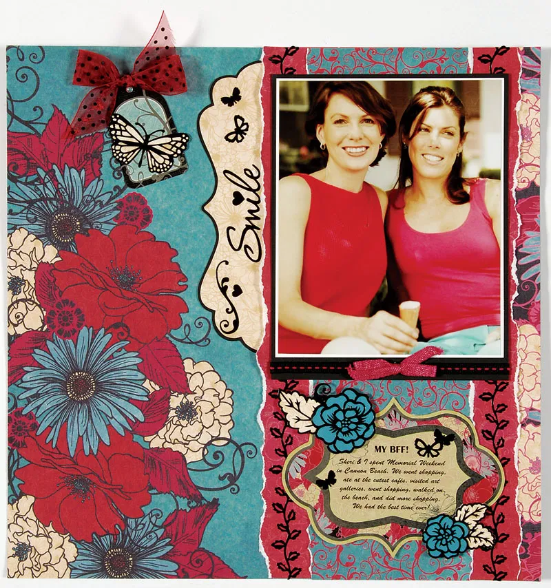 Use the Fresh Cut teal paper with flowers on the left for the background. Glue a 1”x12” strip of Fresh Cut flowered paper on the right edge. Cut a 6 1/4”x12” Fresh Cut red paper and tear along the long edges. Glue to the page 1/2” from the right, leaving the top left edge unglued for the title. Cut a 4 1/4”x12” Fresh Cut teal/pink swirl and tear the long edges. Glue centered on the red paper.