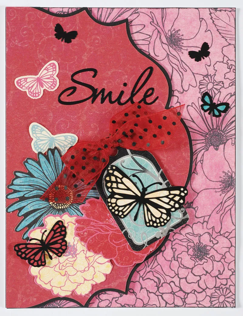 Place “Love & Happiness” on a pink label and foam tape to the card 1/2” from the top and right.