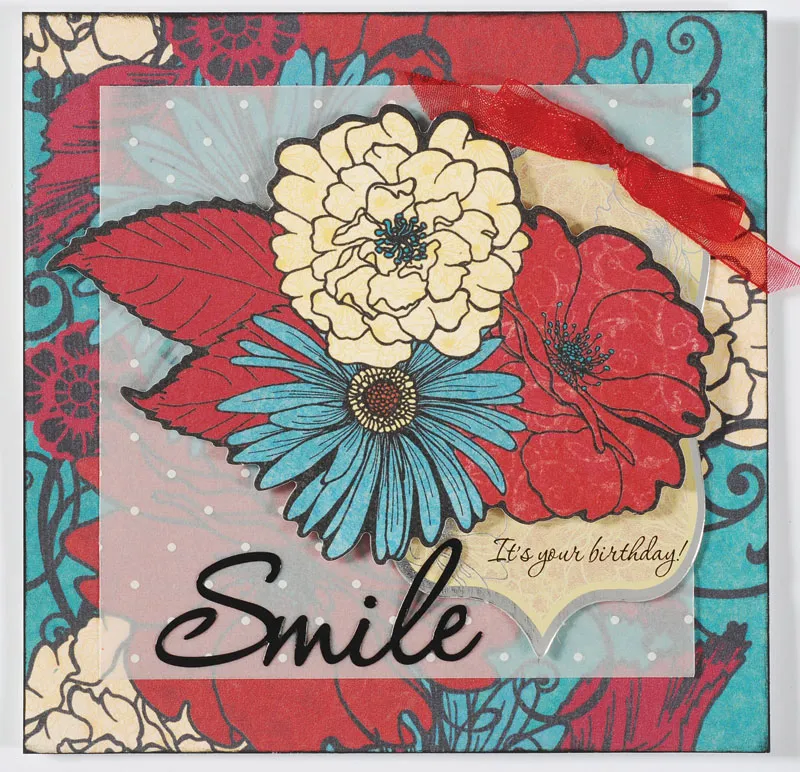 Place “Smile” word sticker along the left bottom edge of the vellum square, so it also overlaps the foil label. Tie a red sheer ribbon bow and Zot it to the top right edge of the foil label.