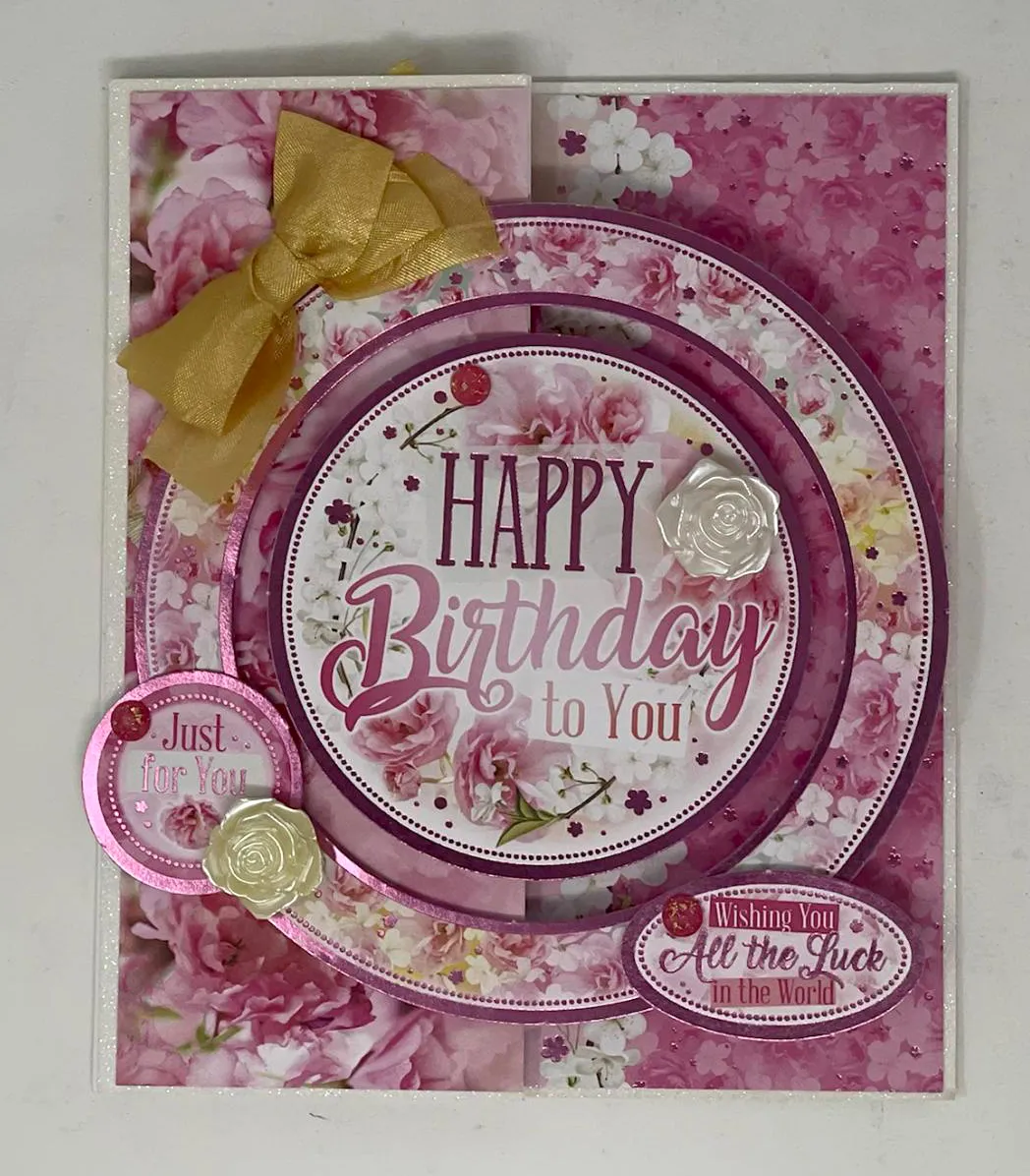 ¼”x5 7/8” of printed Adorable Scorable. Glue flush to the card center. Select the large Happy Birthday circle Topper. Foam tape the outer frame to the left side of the card. Zot™️ a 1 1/2" wide bow as shown. Glue the "Just for You" Topper on the left. Foam tape "Wishing You" along outer frame. Place a yellow rose and Diamond Sparkles as Shown.